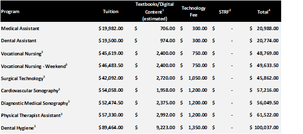 Tuition and direct expenses vary by program and are listed above. The indirect expenses below are based off a monthly average and may be prorated when academic years are shorter or longer. Indirect expenses reflect an average cost of the components that fall within the category. For additional cost of attendance budgets please contact the Financial Aid office.